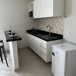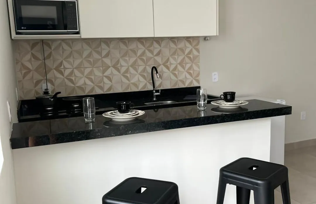 Cf Flat 01 tem varanda e cozinha totalmente equipada, e confortos como controle de temperatura.